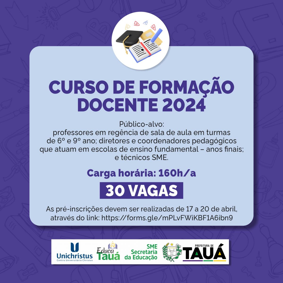 A Secretaria de Educação do Município de Tauá abre nesta quarta-feira (17), inscrições para o Curso de Formação Docente para o Ensino Fundamental II a ser ministrado pelo Centro Universitário Christus (Unichristus), por intermédio do Mestrado Profissional em Ensino na Saúde e Tecnologias Educacionais (MESTED), em parceria com a Secretaria Municipal da Educação de Tauá.