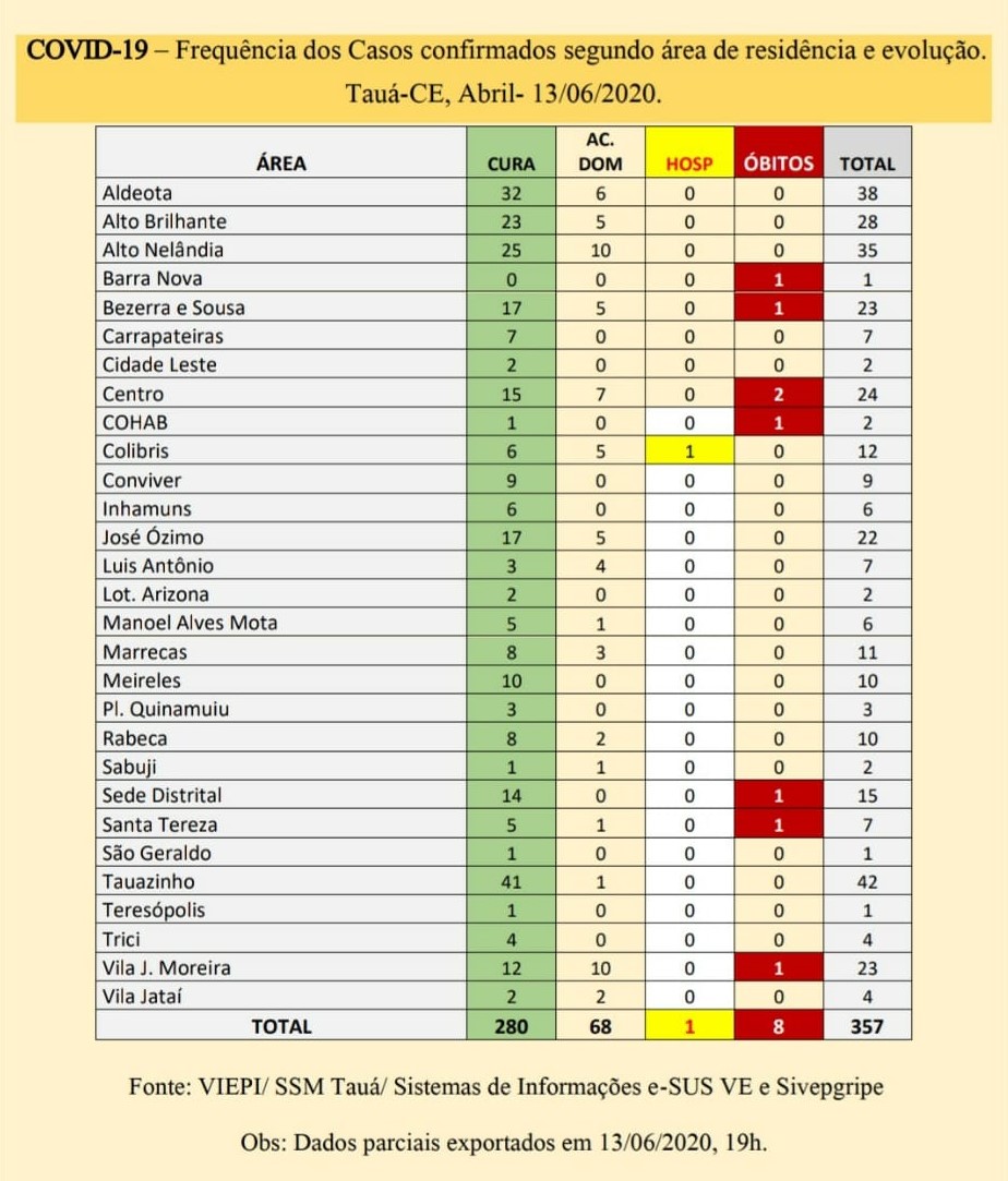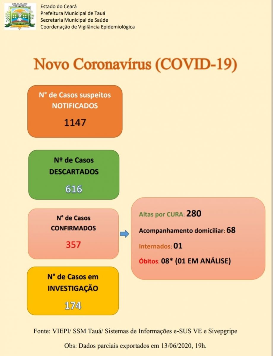 Na publicação anterior, os casos confirmados desde o início da pandemia eram 339 e no boletim atual, são 357 casos. Os pacientes curados eram 270 e agora, 280.