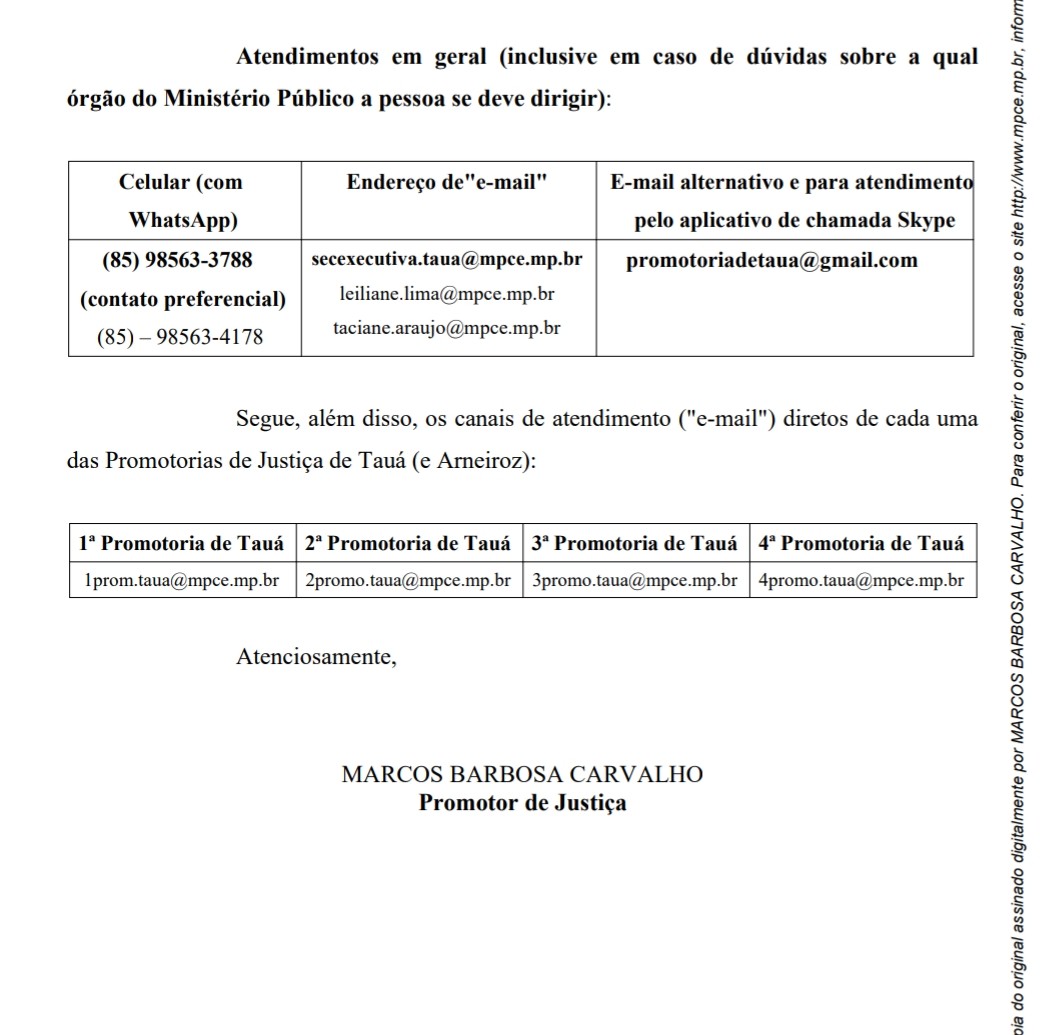 O Ministério Público prorrogou o atendimento virtual à população dos municípios de Tauá e Arneiroz até o dia 30 de junho, devido a pandemia do Coronavírus.