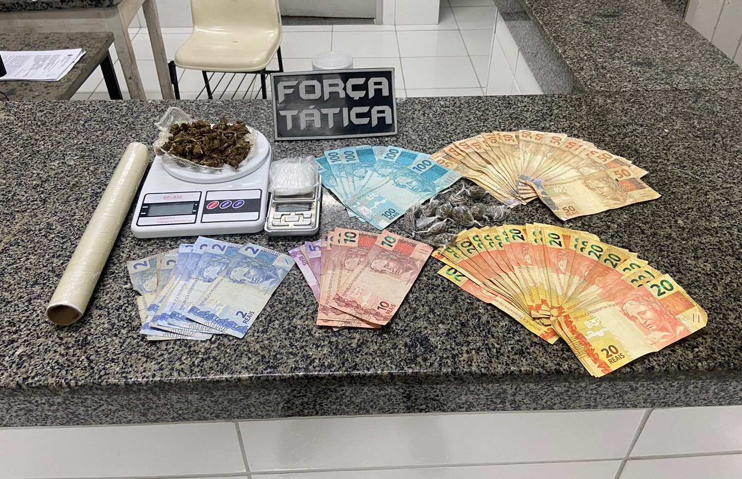 O próprio morador permitiu a entrada dos policiais e informou o local onde havia a quantia de R$ 2.936 reais em espécie, duas balanças de precisão, papel insufilme e invólucros de sacolé, além de cerca de 30 gramas de maconha do tipo FLOR já fracionada.