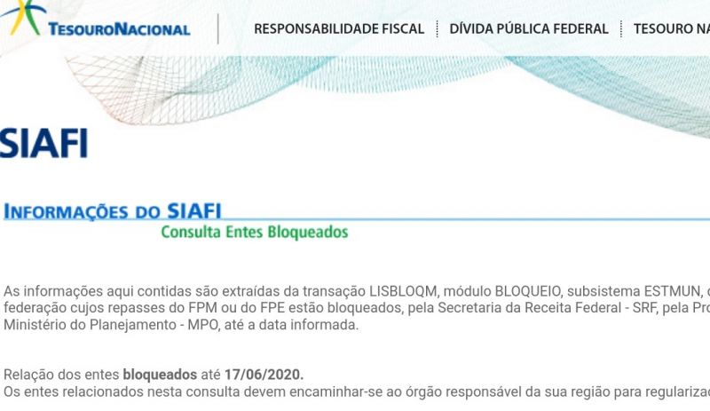 A publicação do Portal diz que "as informações aqui contidas são extraídas da transação LISBLOQM, módulo BLOQUEIO, subsistema ESTMUN, do SIAFI. O usuário pode consultar os entes da federação cujos repasses do FPM ou do FPE estão bloqueados, pela Secretaria da Receita Federal - SRF, pela Procuradoria Geral da Fazenda Nacional - PGFN ou pelo Ministério do Planejamento - MPO, até a data informada" e orienta que "entes relacionados nesta consulta devem encaminhar-se ao órgão responsável da sua região para regularização e desbloqueio".