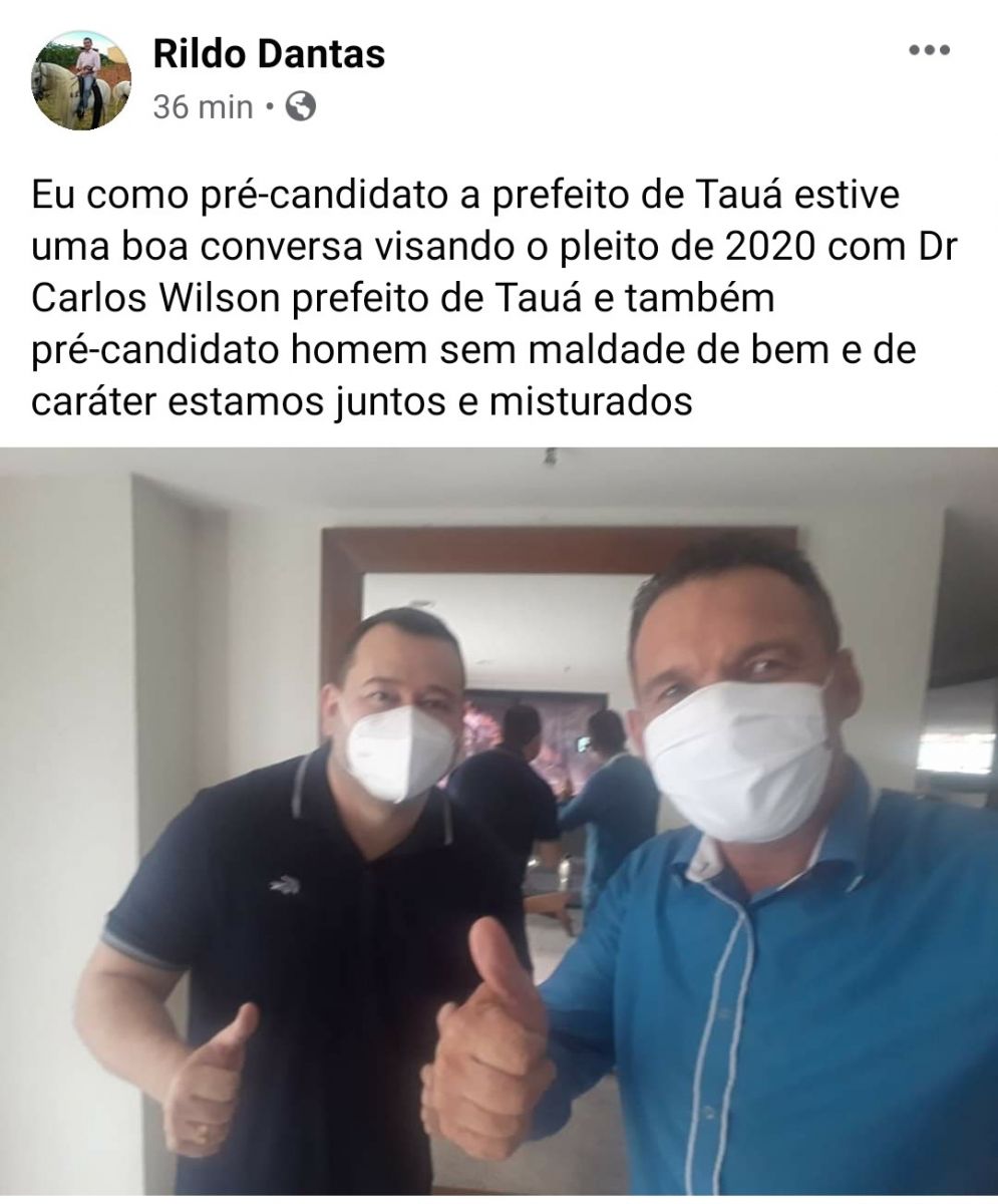 Na última segunda-feira(18), o ex-vereador Rildo Dantas, do Partido Republicanos, também divulgou em uma rede social que permanece na condição de pre´-candidato a Prefeitura de Tauá. A postagem foi feita logo depois de um encontro com o também prefeiturável Dr. Carlos Windson.