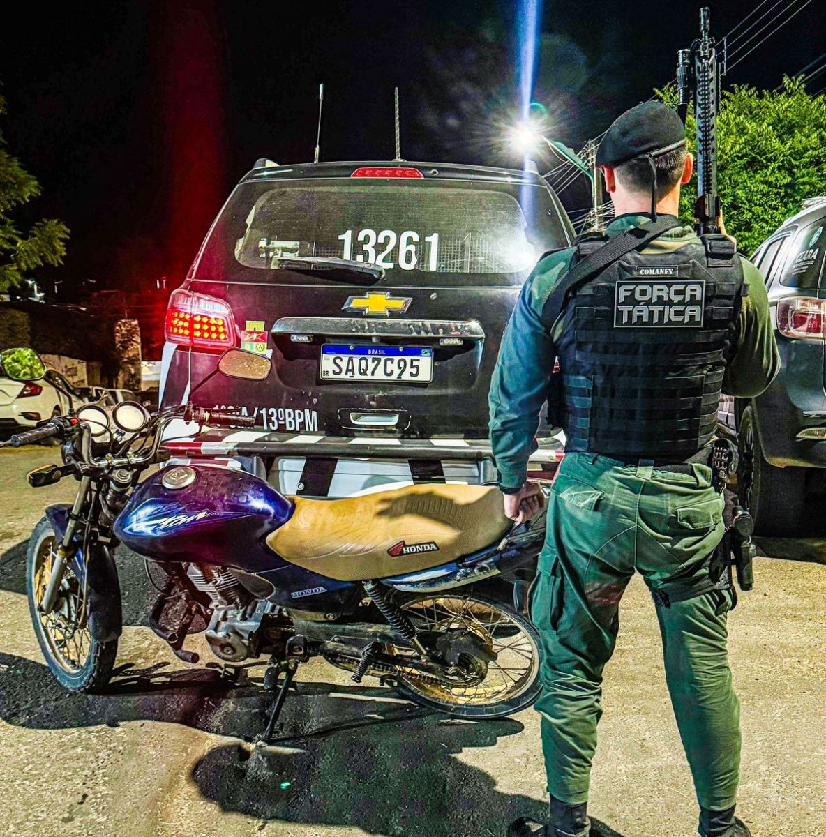 Uma moto Honda CG Titan 125, cor azul, ano 2023, placa KLX-4694 inscrição de Recife/PE, foi apreendida na noite de hoje (28), pelas equipes ALFA e BRAVO da Força Tática do 13º BPM, sediado em Tauá.