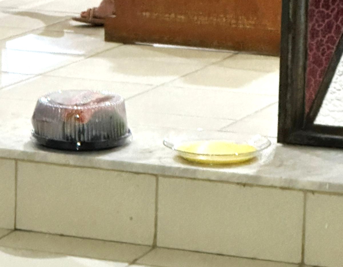 Os produtos foram deixados na porta lateral e quando a equipe chegou por volta das 18h para abrir a Igreja e realizar os preparativos para a celebração, se deparou com o caso. No prato de vidro havia canjica e no recipiente plástico, um bolo no formato de coração e algumas frutas.