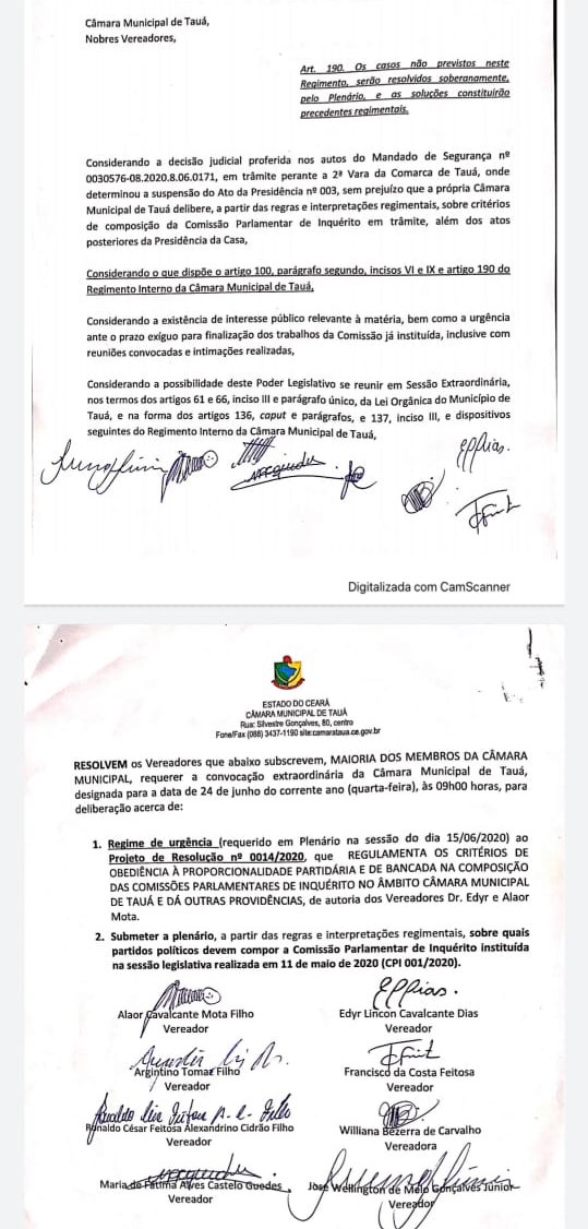 Os vereadores que integram as bancadas do PSB e PP apresentaram um Requerimento assinado por 8 vereadores convocando a Câmara Municipal de Tauá para uma sessão extraordinária às 9h da manhã desta quarta-feira(24).