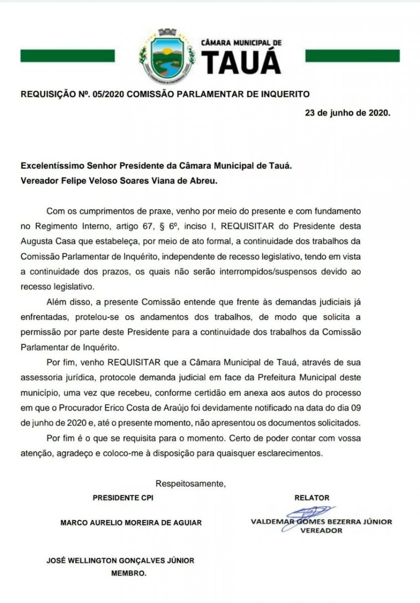 O Relator da Comissão, vereador Valdemar Jr. também apresentou Requisição ao Presidente da Câmara, vereador Felipe Viana, solicitando que a assessoria jurídica do poder protocole ação judicial obrigando a Prefeitura de Tauá a encaminhar a documentação solicitada junto a Procuradoria Geral do Município no último dia 09 e ainda não encaminhada.