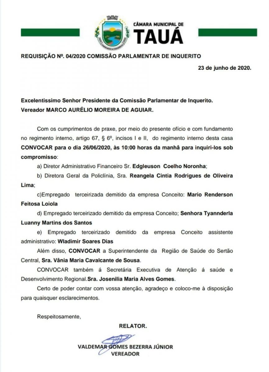 A Comissão Parlamentar de Inquérito instalada pela Câmara Municipal de Tauá aprovou a convocação de 6 pessoas, entre ex-diretores, ex-servidores e gestores de Saúde em nível estadual, para prestarem depoimento nas investigações sobre a demissão, contratação, assédio moral, dentre outros, supostamente praticados pelo Consórcio de Saúde Pública da Região dos Inhamuns.