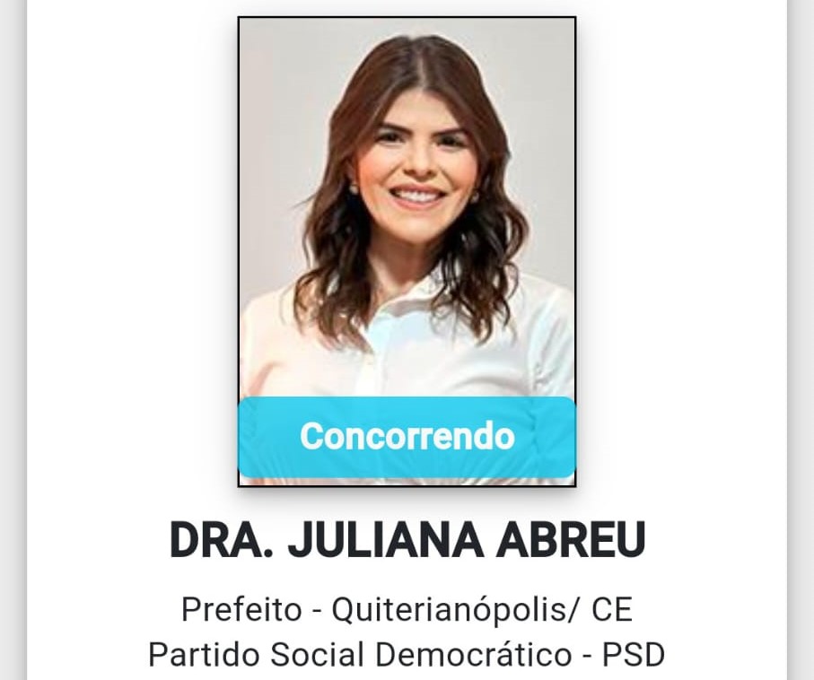 Dra. Juliana é filiada ao PSD, e teve seu nome anunciado na manhã da quarta-feira (05/09). Ela terá o apoio da coligação composta por 8 partidos, PSD/PP/PDT/MDB/PRD/PRTB/PSB/SOLIDARIEDADE. Manoel Vieira permanece candidato a Vice-prefeito da Chapa.