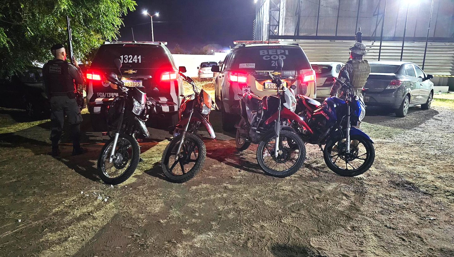 Por volta de 3h, as composições realizavam abordagens e identificação veicular em veículos suspeitos e na Rua Rua Eneias de Castro, no centro, foram localizadas 4 motocicletas com indícios de adulteração nos sinais identificadores (clonagem veicular. Diligências foram feitas no sentido de localizar os donos, mas sem êxito.