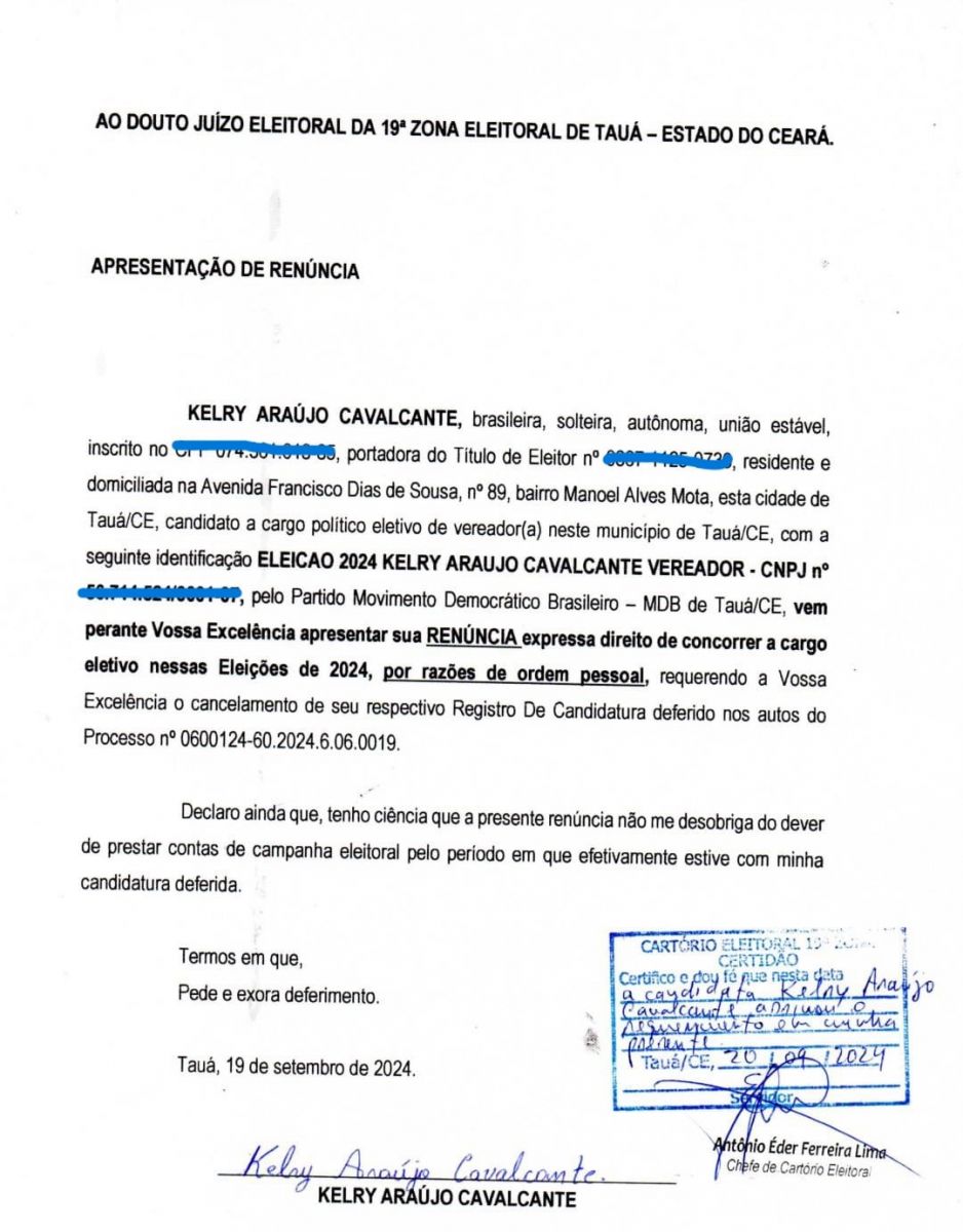 A jovem Kelry Araújo Cavalcante, renunciou sua candidatura a vereadora nas Eleições de 2024 no município de Tauá.