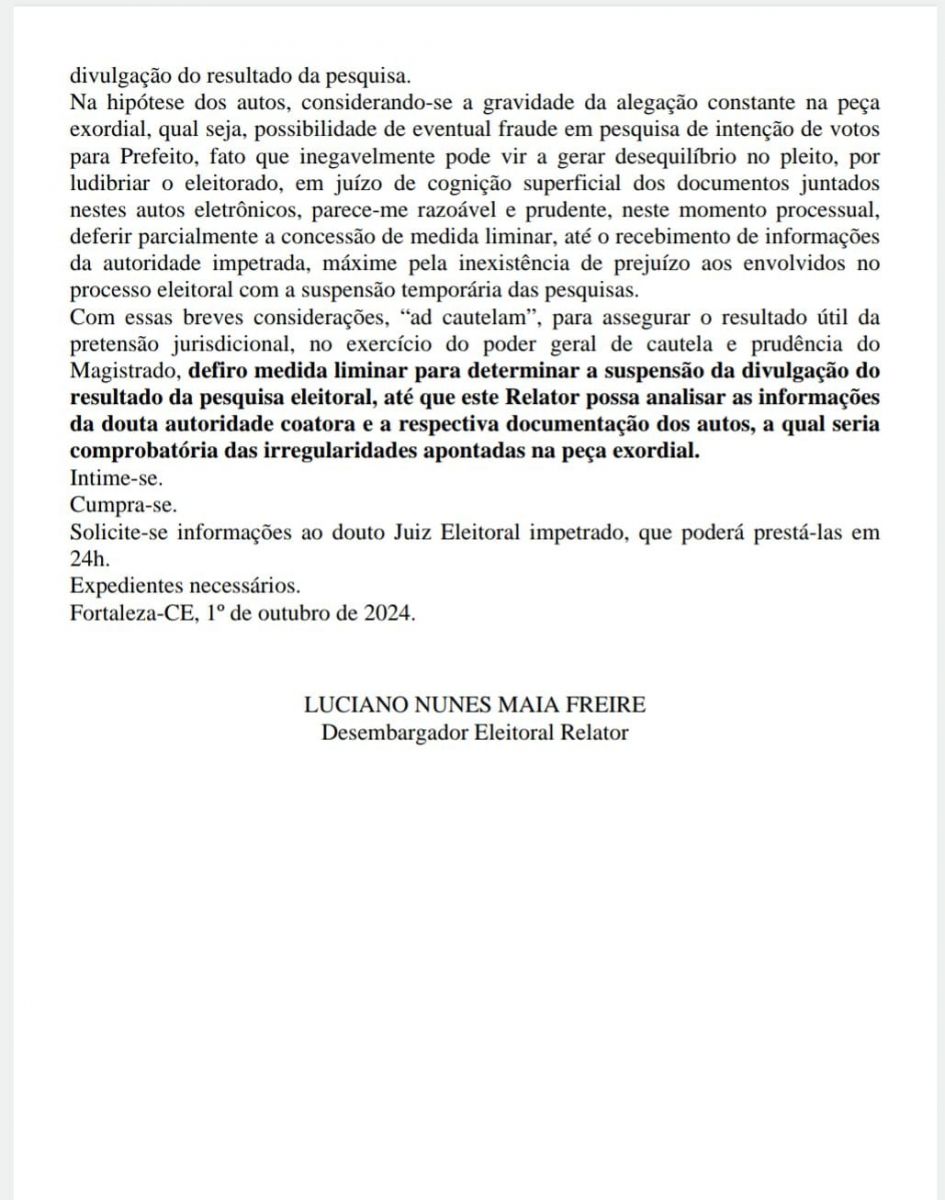 A decisão liminar concedida pelo Desembargador Luciano Nunes Maia Freire, foi publicada às 8:35h da manhã de hoje (01/10). "Defiro medida liminar para determinar a suspensão da divulgação do resultado da pesquisa eleitoral, até que este Relator possa analisar as informações da douta autoridade coatora e a respectiva documentação dos autos, a qual seria comprobatória das irregularidades apontadas na peça exordial", diz trecho da decisão.