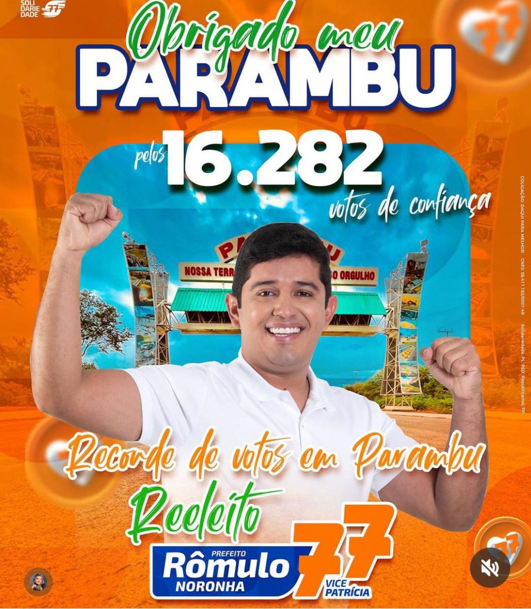 Romulo Noronha, do SOLIDARIEDADE, foi eleito neste domingo (6) prefeito de Parambu (CE) para os próximos quatro anos. Ao fim da apuração, Romulo Noronha teve 16.282 votos, 80,65% dos votos válidos (dados a todos os candidatos).