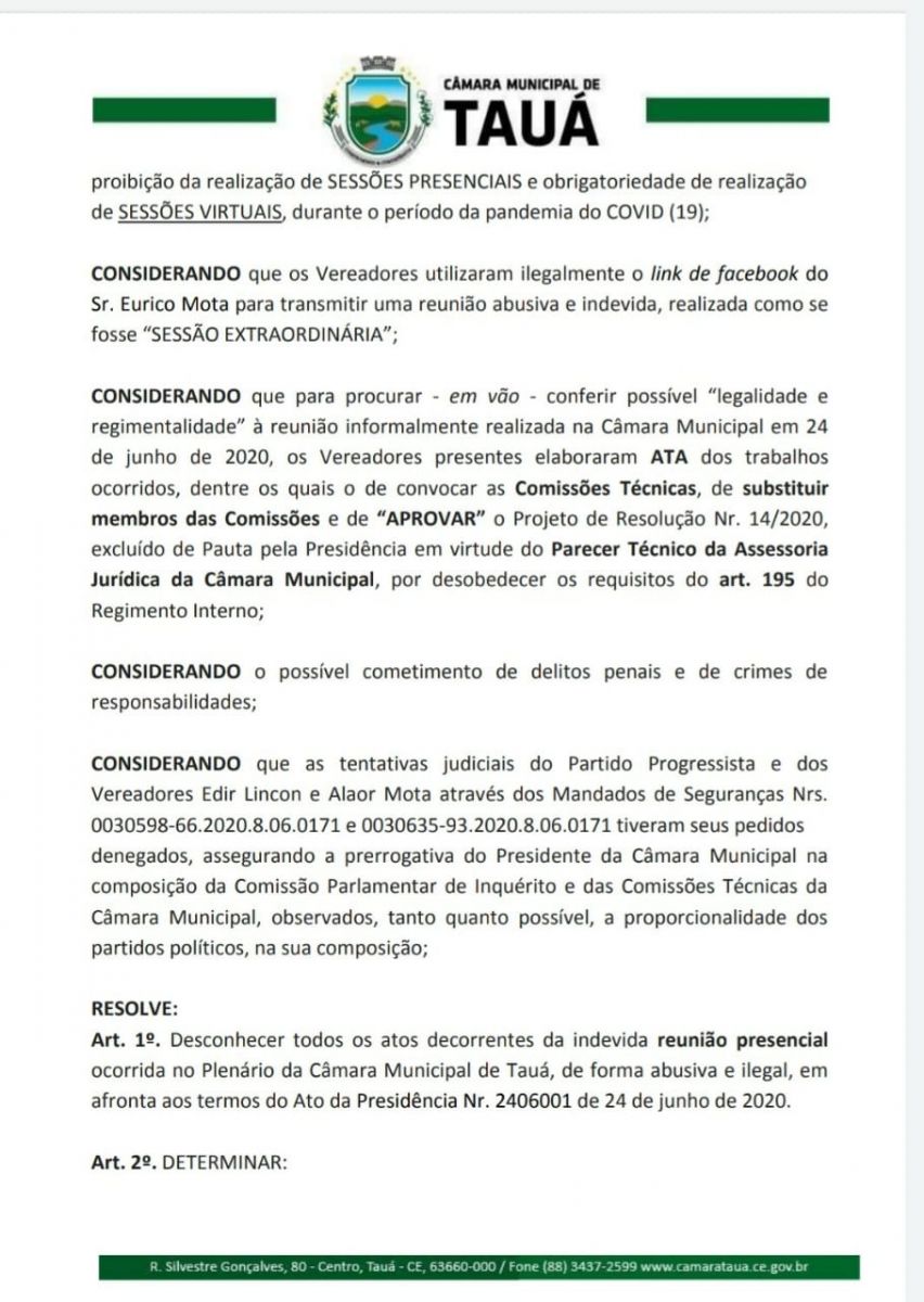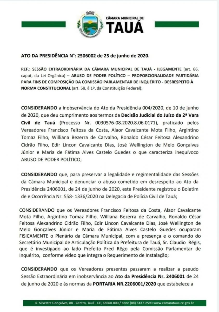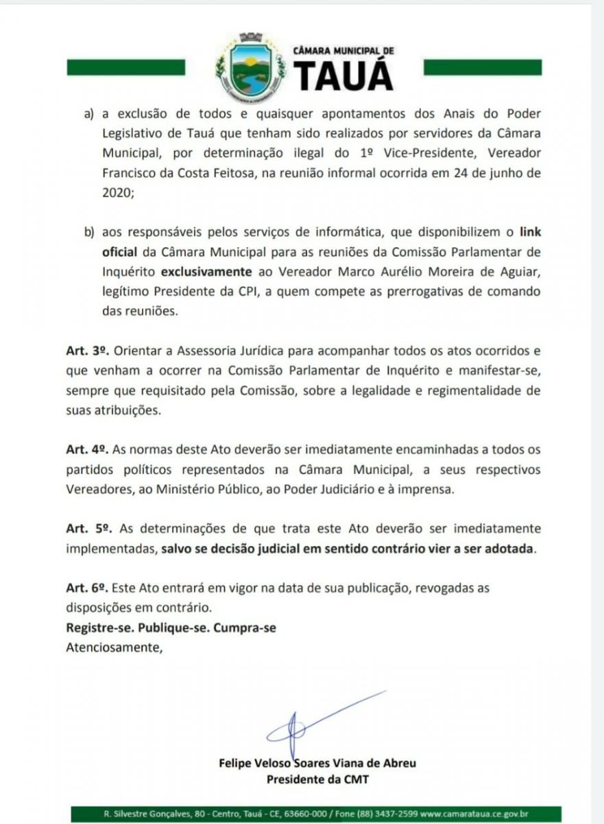 O Presidente da Câmara Municipal de Tauá, vereador Felipe Viana em decisão divulgada na noite de ontem(25), resolveu anular todos os atos ocorridos na última quarta-feira(24), quando um grupo de 8 vereadores realizou sessão extraordinária que havia sido convocada pelas bancadas do PSB e PP para votar projeto que trata da alteração da composição e proporcionalidade partidária na composição de CPIs instaladas pelo legislativo.