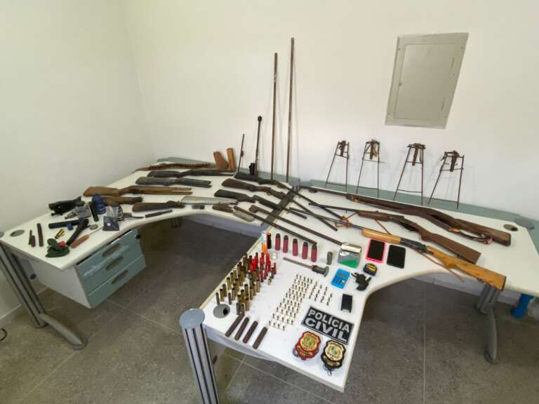 Na ocasião, foram apreendidos 11 armas de fogo – sendo um rifle, duas espingardas, quatro espingardas desmontadas (calibres 32 e 36), quatro armas artesanais – e mais de 130 munições, bem como, recipiente contendo pólvora, ferramentas usadas na fabricação de armas e uma máquina de cartão de crédito. No local, dois homens foram presos.
