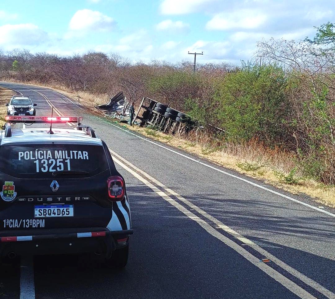 Um caminhão tombou na madrugada de hoje (15/11), na CE-176, na zona rural do município de Aiuaba.