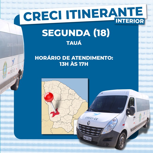 Mais de 90 mil quilômetros percorridos, mais de 60 municípios visitados e quase mil atendimentos realizados em quatro anos de projeto. Durante os dias 18 de novembro e 22 de novembro, o programa Creci Itinerante visita as cidades de Tauá, Crateús, Independência, Nova Russas, Santa Quitéria e Canindé.