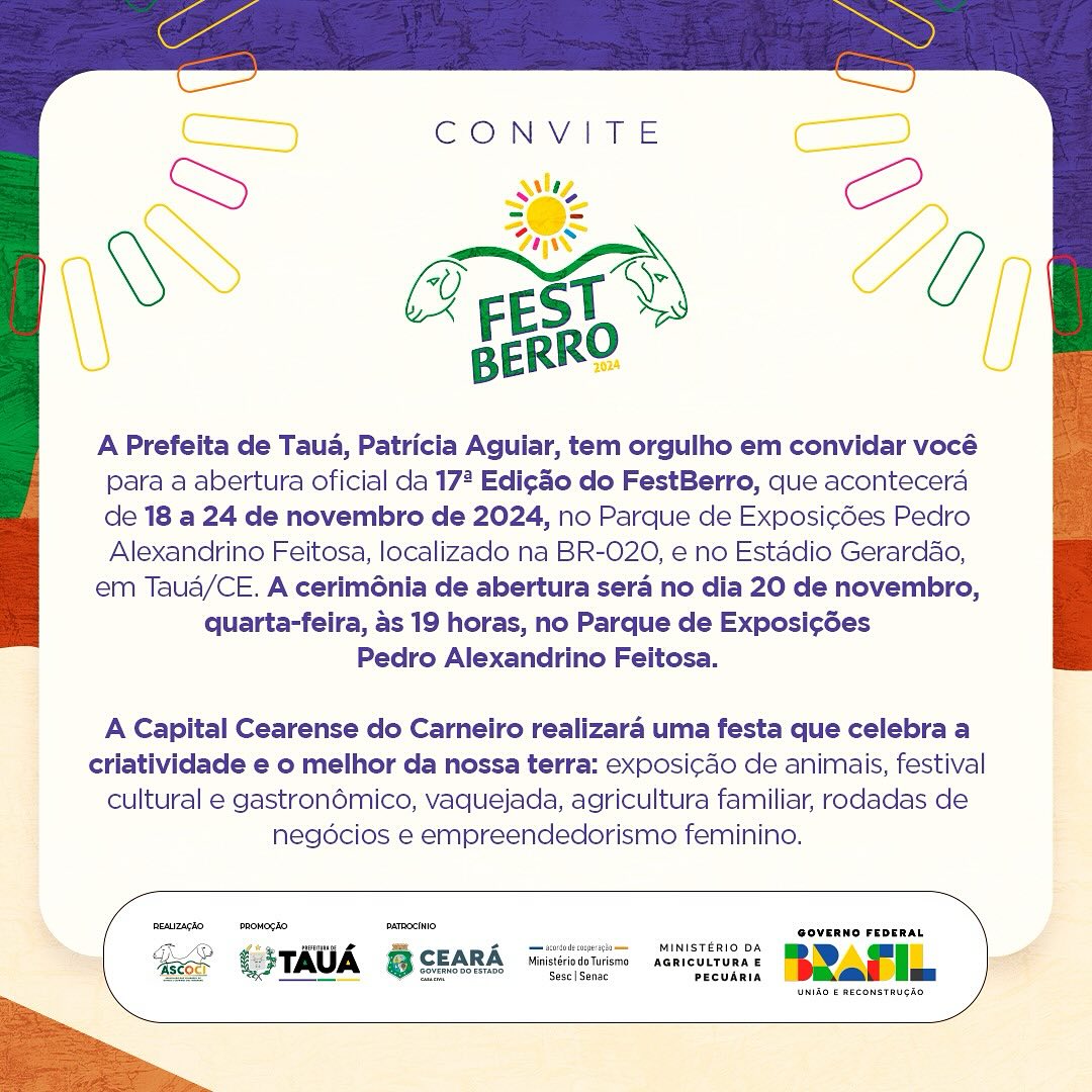 Segundo a Prefeita Patrícia Aguiar, a 17ª Edição do FestBerro será a maior da história e acontecerá no Parque de Exposições Pedro Alexandrino Feitosa. Ela aproveitou o ensejo para convidar toda a população de Tauá, região e do Estado do Ceará para participar também dos grandes shows gratuitos com artistas nacionais, que serão realizados no Estádio Gerardão, entre os dias 21 e 23 de novembro.
