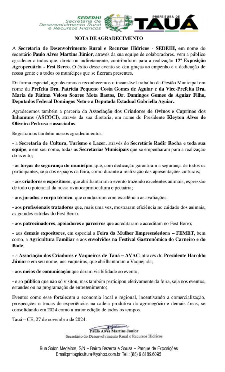 A Secretaria de Desenvolvimento Rural e Recursos Hídricos do Município de Tauá divulga Nota de Agradecimento a todos os que contribuíram com a realização da 17ª Edição do FestBerro 2024, realizada no Parque de Exposições Pedro Alexandrino Feitosa, no períoro de 18 a 26 de novembro, com uma vasta programação que incluiu a Feira de Animais, Vaquejada, Festival Cultural Terra dos Inhamuns, Carneirode, Festival Gastronômico, Feira da Agricultura Familiar e a Feira da Mulher Empreendedora e da Agricultura Familiar, Cursos, Palestras, Shows Culturais, dentre outros eventos.