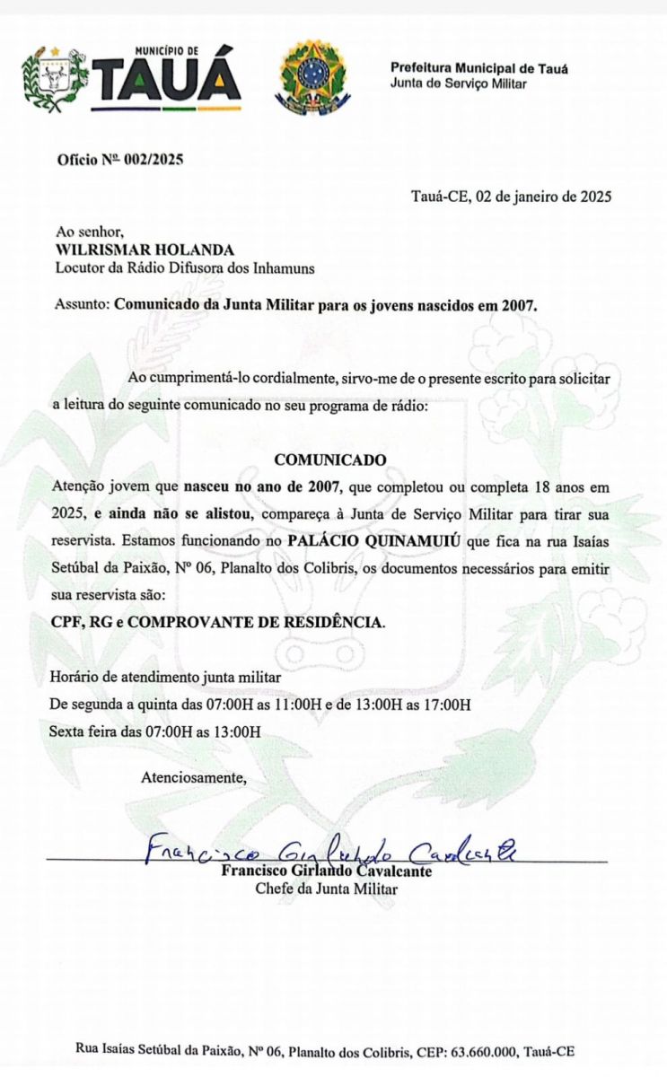 A Junta de Serviço Militar orienta jovens do sexo masculino, que completarão 18 anos em 2025, para o alistamento militar obrigatório.