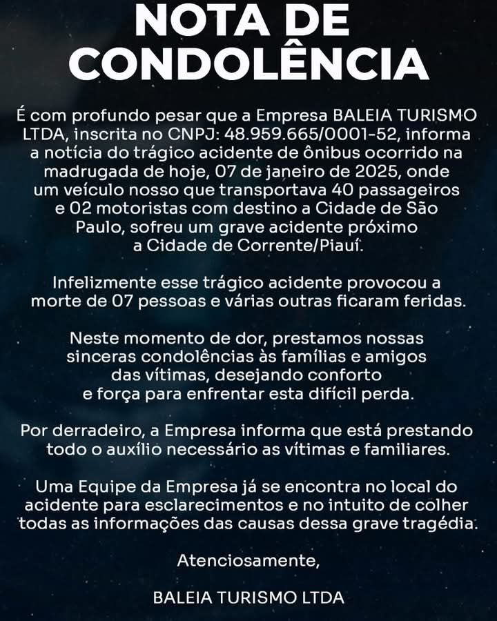 A Empresa tauaense Baleia Turismo lamentou o trágico acidente ocorrido na madrugada de hoje (07/01), que deixou 7 mortos e 15 feridos, no Estado do Pìauí.