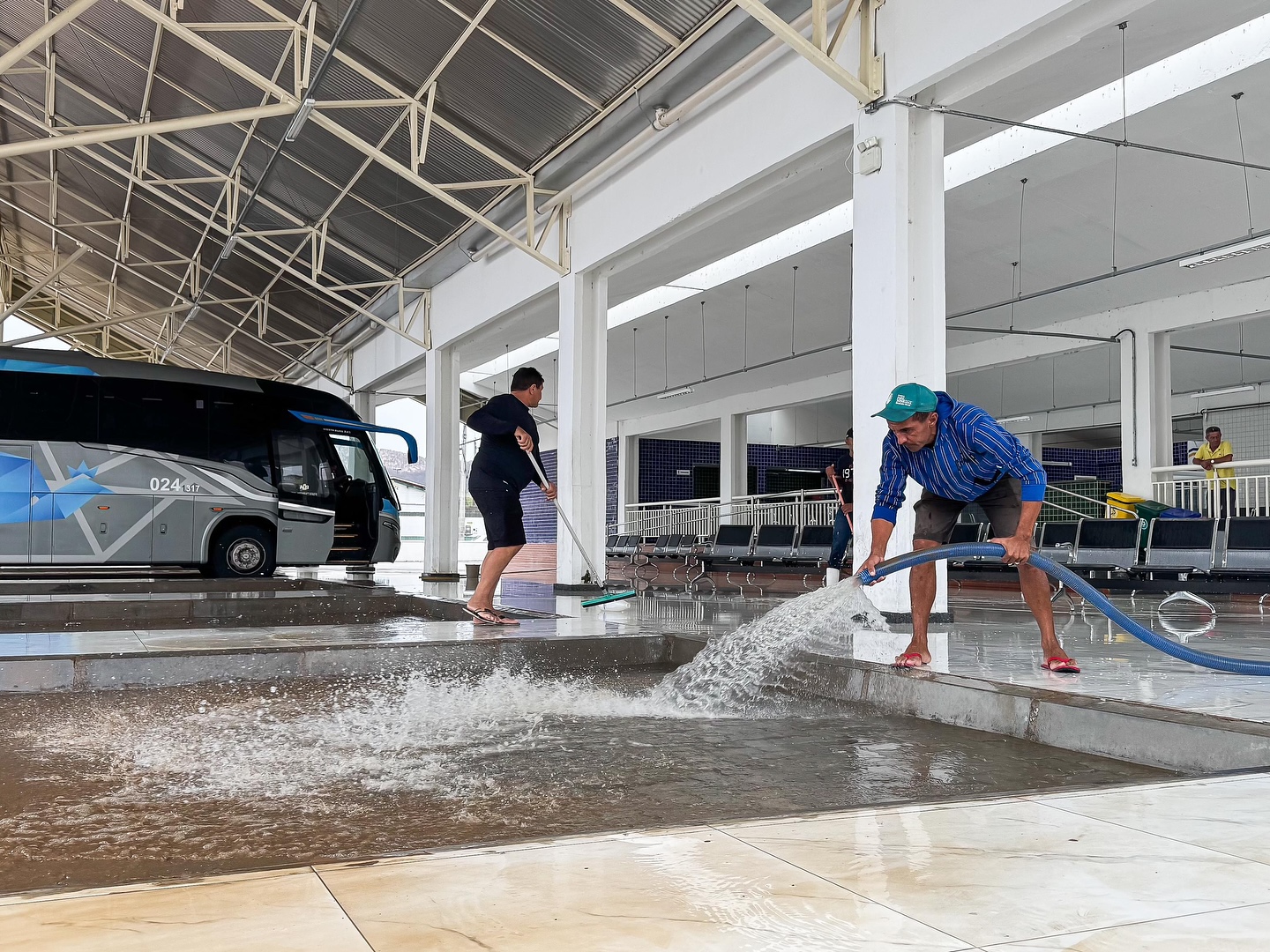 Na Estação Rodoviária, no área do embarque e desembarque também houve alagamentos.