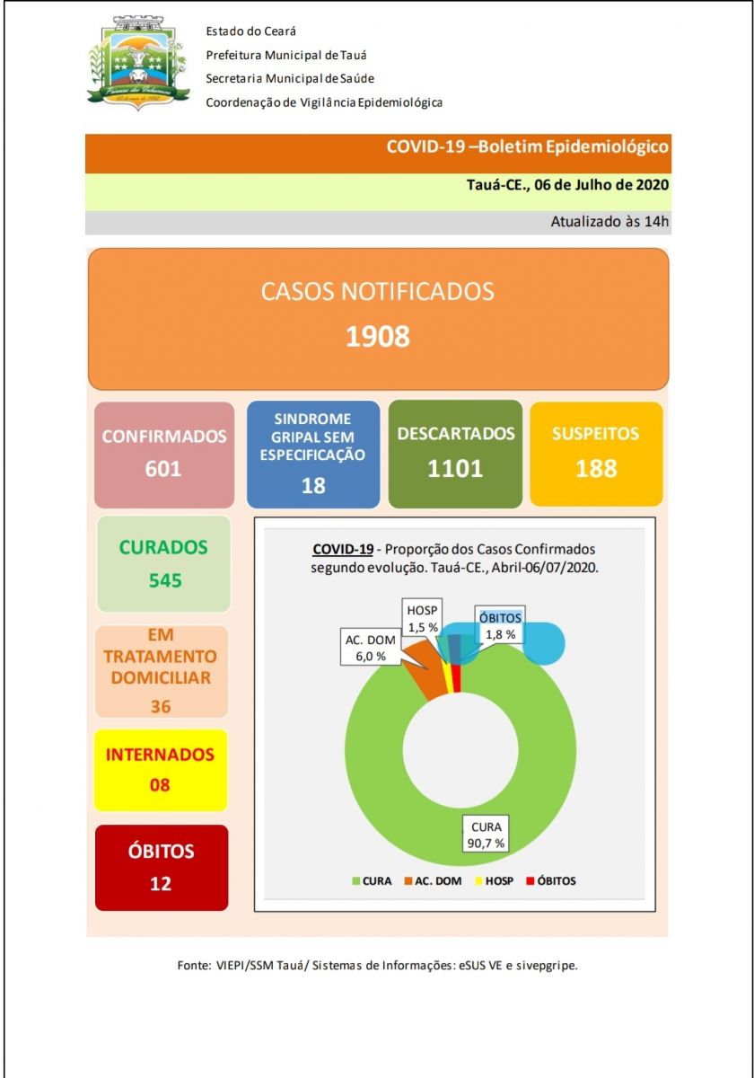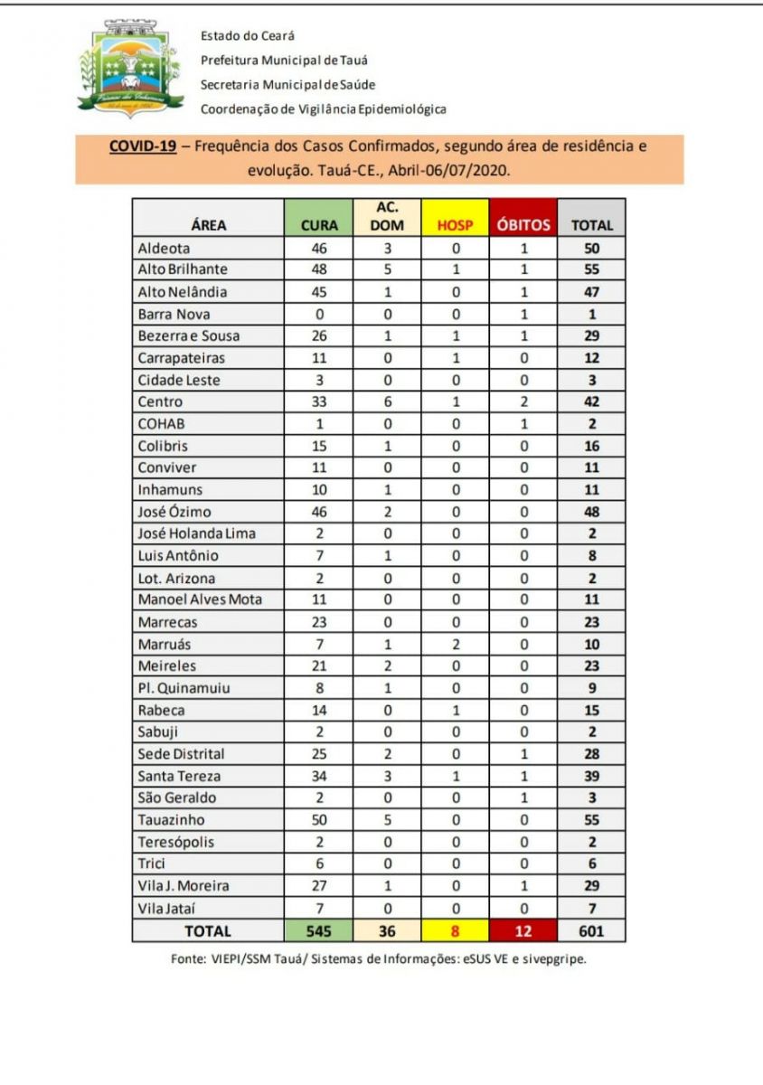 O boletim epidemiológico divulgado na tarde de hoje(06) pela Secretaria de Saúde confirmou o 12º óbito por coronavírus no município de Tauá. O paciente residia no Bairro Alto Nelândia.