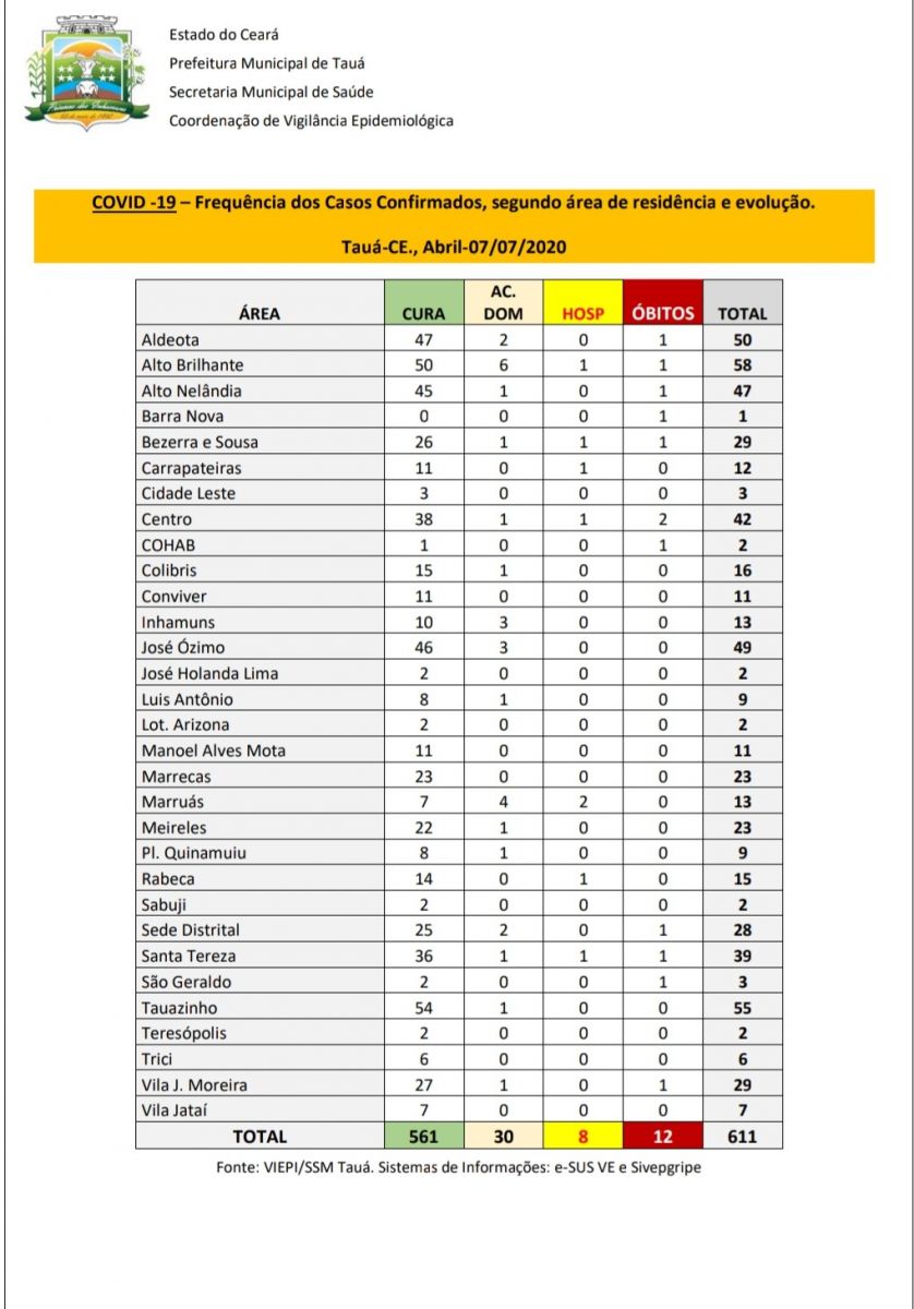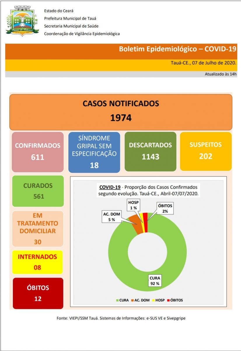 Desde o início da pandemia, Tauá confirmou 611 casos e 561 pacientes curados. Os óbitos são 12.