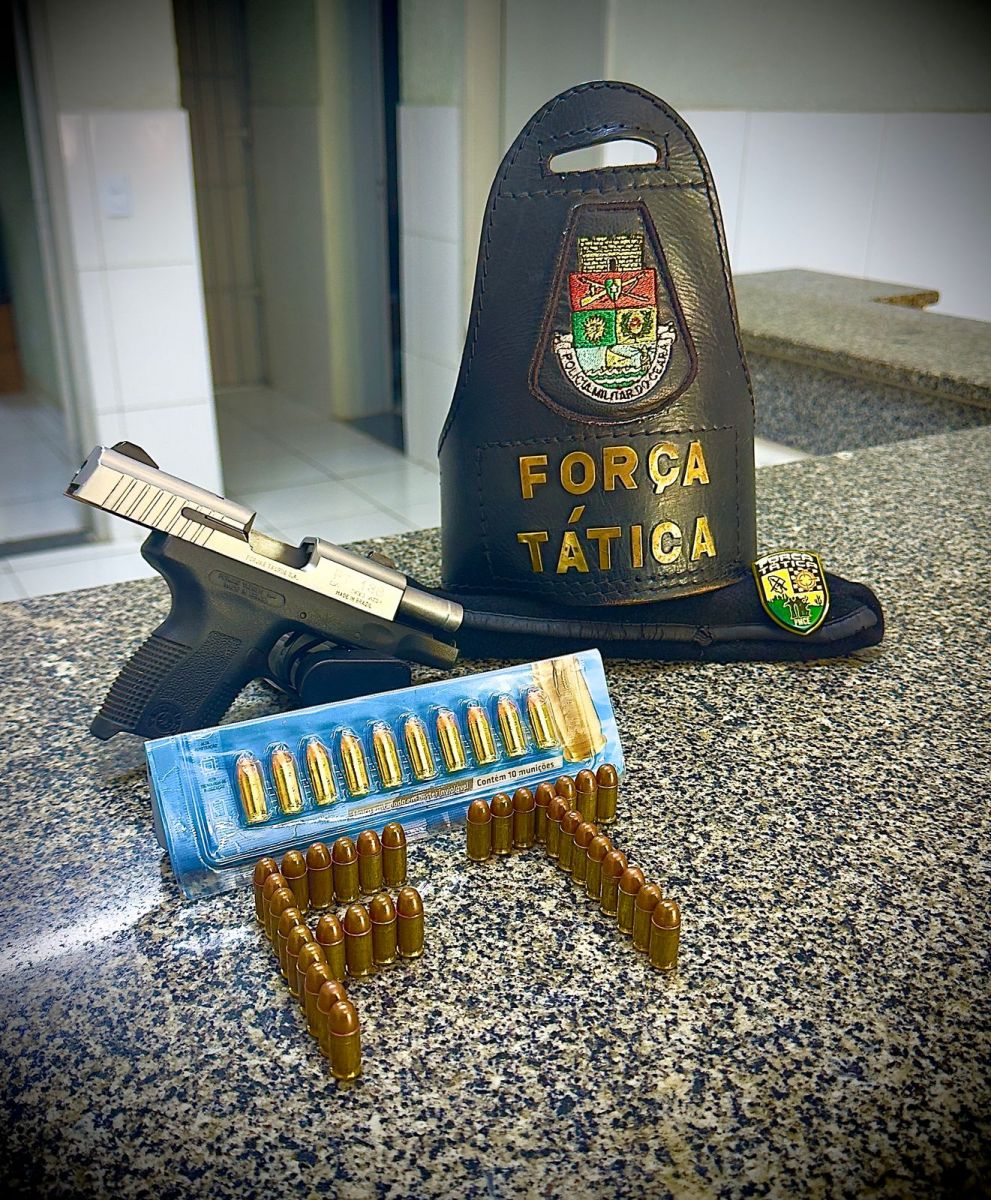 Ao chegar no local, a composição abordou Gilder Oliveira Batista, 27 anos, que confirmou a existência da arma e que estava em cima do guarda-roupas. Os policiais encontraram uma pistola Taurus PT 138, calibre 380, 43 munições do mesmo calibre e 01 carregador.