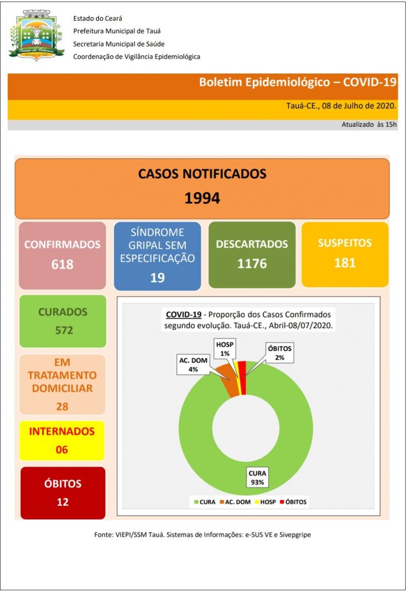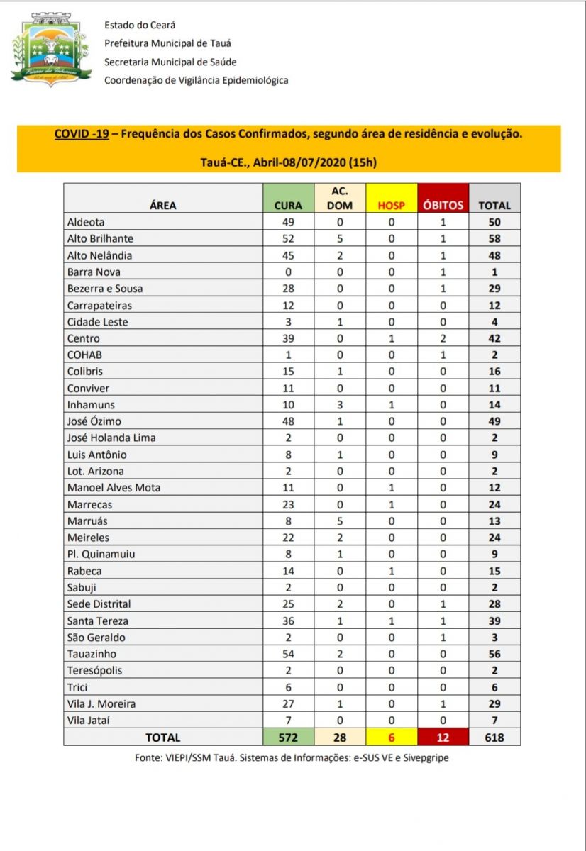 O município tem 618 casos confirmados e 572 pacientes curados. A doença já matou 12 pessoas em Tauá.